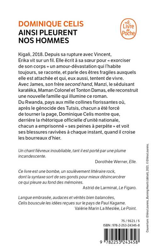 Kigali, 2018. Depuis sa rupture avec Vincent, Erika vit sur un fil. Elle écrit à sa sœur pour « exorciser de son corps » un amour dévastation qui l’habite toujours, se raconte, et parle des êtres fragiles auxquels elle est attachée et qui, eux aussi, tentent de vivre. Avec James, son frère second hand, Manzi, le séduisant karatéka, Maman Colonel et Tonton Damas, elle reconstruit une nouvelle famille qui illumine ce roman. Du Rwanda, pays aux mille collines florissantes où, après le génocide des Tutsis, chacun a été forcé de tourner la page, Dominique Celis montre que, derrière la rhétorique officielle d’unité nationale, chacun a emprisonné « ses peines à perpète » et voit ses blessures ravivées à chaque instant, quand il croise les bourreaux d’hier…