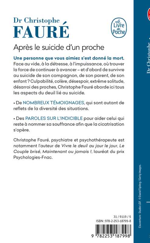Une personne que vous aimiez s'est donné la mort. Face au vide, à la détresse, à l'impuissance, où trouver la force de continuer à avancer – et d'abord de survivre au suicide de son compagnon, de son parent, de son enfant ? Culpabilité, colère, désespoir, extrême solitude, désarroi des proches, Christophe Fauré aborde ici tous les aspects du deuil lié au suicide.