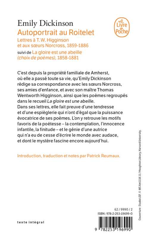 La partie de la « Correspondance » ici traduite – « Lettres à T.W. Higginson et aux sœurs Norcross » – n’a pu l’être que grâce au remarquable appareil critique de l’édition américaine Harvard University Press. Les poèmes que l’on trouvera en seconde partie de volume parlent d’eux-mêmes.
