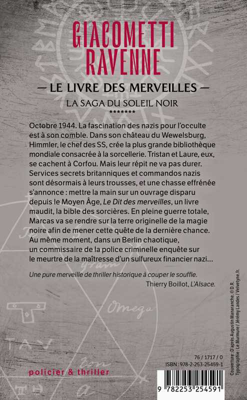 Octobre 1944. La fascination des nazis pour l’occulte est à son comble. Dans son château du Wewelsburg, Himmler, le chef des SS, crée la plus grande bibliothèque mondiale consacrée à la sorcellerie. Tristan et Laure, eux, se cachent à Corfou. Mais leur répit ne va pas durer. Services secrets britanniques et commandos nazis sont désormais à leurs trousses, et une chasse effrénée s’annonce : mettre la main sur un ouvrage disparu depuis le Moyen Âge, Le Dit des merveilles, un livre maudit, la bible des sorcières. En pleine guerre totale, Marcas va se rendre sur la terre originelle de la magie noire afin de mener cette quête de la dernière chance.