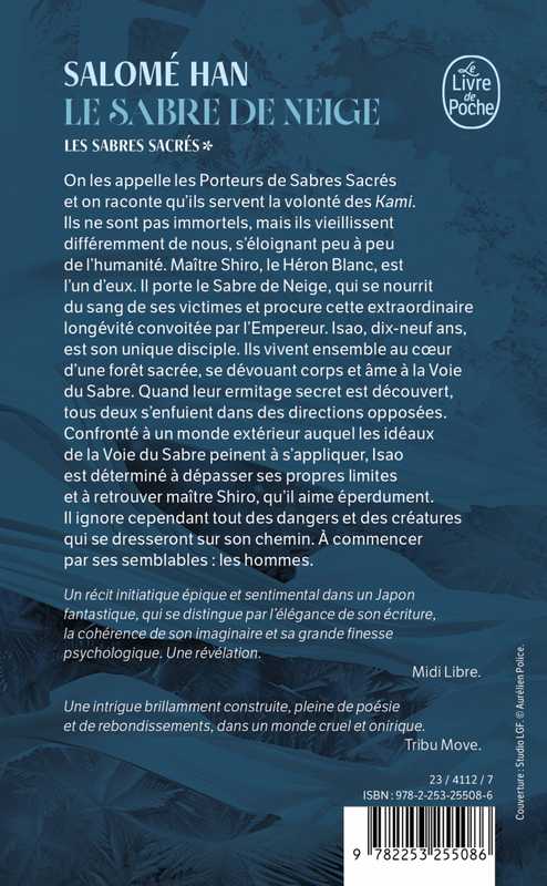 On les appelle les Porteurs de Sabres Sacrés et on raconte qu’ils servent la volonté des Kami. Ils ne sont pas immortels, mais vieillissent différemment de nous, s’éloignant peu à peu de l’humanité. Maître Shiro, le Héron Blanc, est l’un d’eux. Il porte le Sabre de Neige, qui se nourrit du sang de ses victimes et procure cette extraordinaire longévité convoitée par l’Empereur en personne. Isao, dix-neuf ans, est son unique disciple. Ils vivent ensemble au cœur d’une forêt sacrée, se dévouant corps et âme à la Voie du Sabre. Quand le jeune homme apprend que la tête du Héron Blanc est mise à prix et que leur ermitage secret est découvert, tous deux se voient obligés de fuir. Confronté à un monde extérieur auquel les idéaux de la Voie du Sabre peinent à s’appliquer, Isao est déterminé à dépasser ses propres limites et à gagner le respect de maître Shiro, qu’il aime éperdument. Mais c’est compter sans les dangers et les créatures qui se dresseront sur son chemin. À commencer par ses semblables : les hommes.