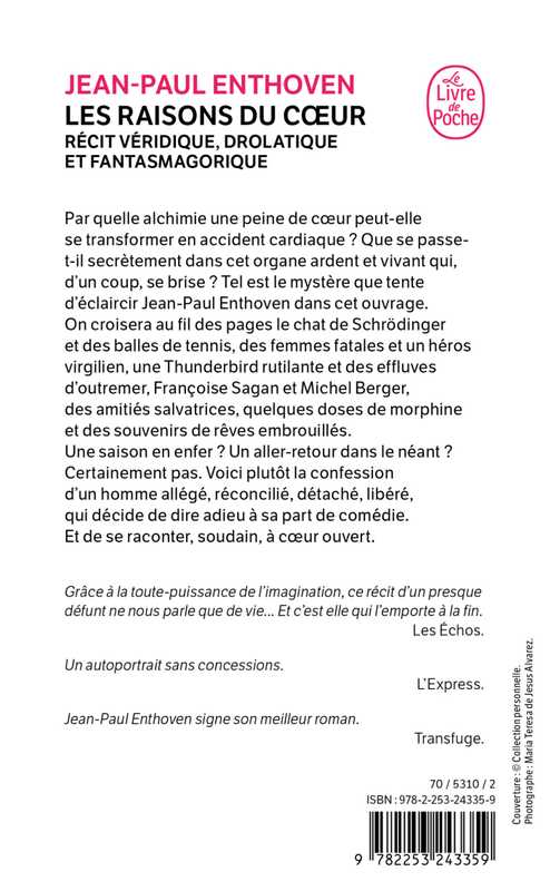 Par quelle alchimie une peine de cœur peut-elle se transformer en un accident cardiaque ? Que se passe-t-il secrètement dans cet organe ardent et vivant qui, d'un coup, se brise ? Tel est le mystère que tente d'éclaircir JeanPaul Enthoven à travers son ouvrage. On croisera dans ces pages le chat de Schrödinger et des balles de tennis, des femmes fatales et un héros virgilien, une Thunderbird rutilante et des effluves d'outremer, Françoise Sagan et Michel Berger, des amitiés salvatrices, quelques doses de morphine et des souvenirs embrouillés de rêves. Une saison en enfer ? Un aller-retour dans le néant ? Certainement pas. Voici plutôt la confession d'un homme allégé, réconcilié, détaché, libéré, qui décide de dire adieu à sa part de comédie. Et de se raconter, soudain, à cœur ouvert.
