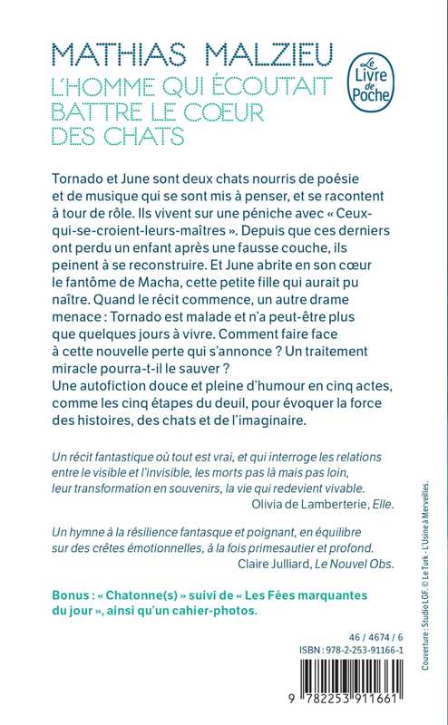 Tornado et June sont deux chats nourris de poésie et de musique qui se sont mis à penser, et se racontent à tour de rôle. Ils vivent sur une péniche avec « Ceux-qui-se-croient-leurs-maîtres ». Depuis que ces derniers ont perdu un enfant après une fausse couche, ils peinent à se reconstruire. Et June abrite en son cœur le fantôme de Macha, cette petite fille qui aurait pu naître. Quand le récit commence, un autre drame menace : Tornado est malade et n’a peut-être plus que quelques jours à vivre. Comment faire face à cette nouvelle perte qui s’annonce ? Un traitement miracle pourra-t-il le sauver ?