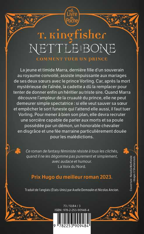 La jeune et timide Marra, dernière fille d’un souverain au royaume convoité, assiste impuissante aux mariages de ses deux sœurs avec le prince Vorling. Car, après la mort mystérieuse de l’aînée, la cadette a dû la remplacer pour tenter de donner enfin un héritier au triste sire. Quand Marra découvre l’ampleur de la cruauté du prince, elle ne peut demeurer simple spectatrice : si elle veut sauver sa sœur et empêcher le sort funeste qui l’attend elle aussi, il faut tuer Vorling. Pour mener à bien son plan, il lui faudra recruter une sorcière capable de parler aux morts et sa poule possédée par un démon, un honorable chevalier en disgrâce et une fée marraine particulièrement douée pour les malédictions.