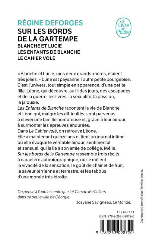 « Blanche et Lucie, mes deux grands-mères, étaient très jolies. » L’une est paysanne, l’autre petite bourgeoise. C’est l’univers, tout simple en apparence, d’une petite fille, Léone, qui découvre, au fil des jours, des escapades et de la guerre, les livres, la sexualité, la passion, la jalousie. Les Enfants de Blanche racontent la vie de Blanche et Léon qui, malgré les difficultés, sont parvenus à élever une famille nombreuse et, grâce à leur amour, à surmonter les épreuves endurées. Dans Le Cahier volé, on retrouve Léone. Elle a maintenant quinze ans et tient un journal intime où elle évoque le véritable amour, sentimental et sensuel, qui la lie à son amie de collège, Mélie.